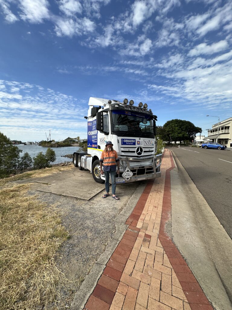 Driver Darren ‘Skinny’ Thomas proudly held the Northern Stevedoring Services banner high as he led a large contingent making up